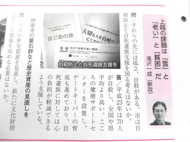 上越市議会の一般質問で、滝沢一成議員に自殺対策・自死遺族支援について取り上げてもらいました。議会において自死遺族という言葉を使ってもらっただけでも一歩前進です。
