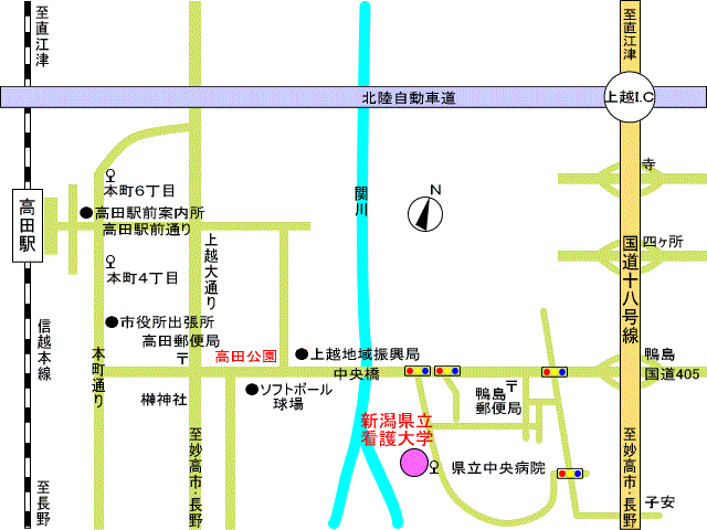 高田駅前案内所、又は、本町4丁目から中央病院行きバス 又は、上牧・宇津の俣行きバスに乗車(所要時間13分) 看護大学下車 北陸自動車道上越インターから車で10分